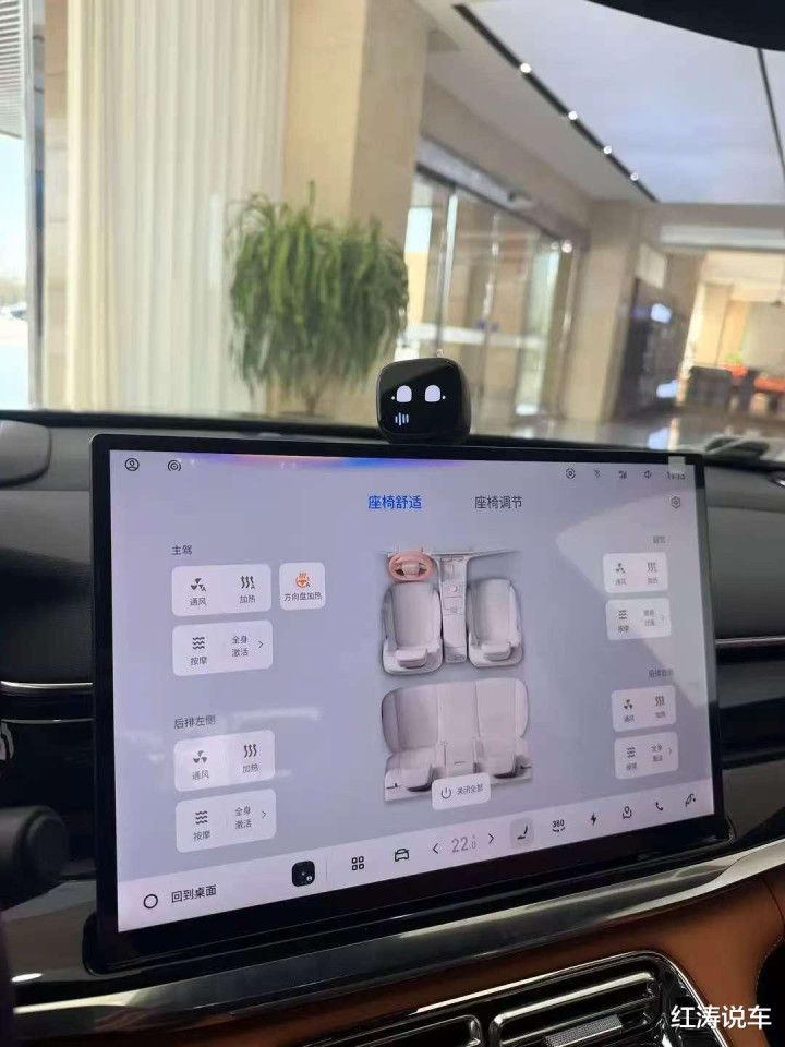 银河7搭载银河Flyme Auto 2智能座舱系统,并且中控屏上面设有智能体,副仪表台是上下双层机构,上面一层有50瓦手机充电面板和实体按键+水晶旋钮,新车提供256色氛围灯、16扬声器、智能香氛、全景天窗+电动遮阳帘等配置。